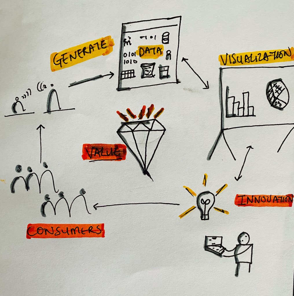 The sketch-note picture above describes how data is generated, visualized and insights which in turn results in innovation. The value of the innovation is in turn consumed by the some of the people who generated the data. This has you thinking how we influence the services you get right? That is the DVV(Data, Value and Visualization).